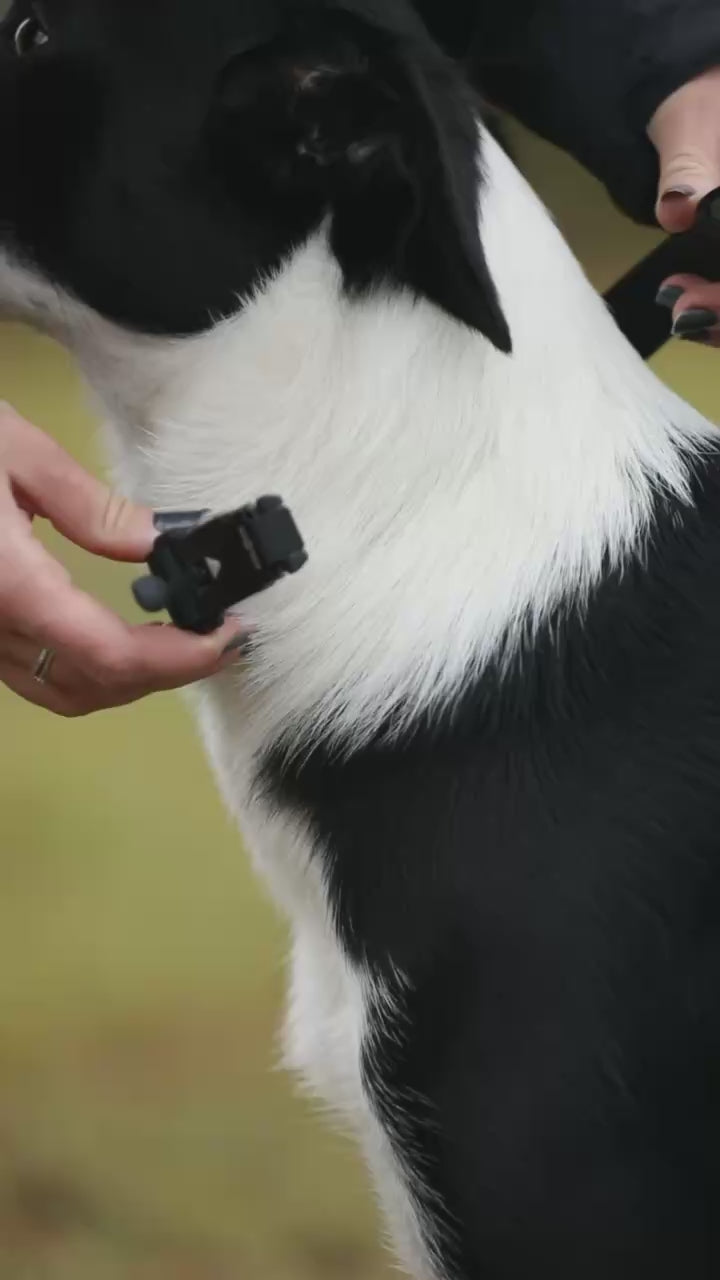 The collar is adjustable and padded with soft, hard-wearing neoprene, ensuring comfort even during longer use. Smoothly stitched edges help prevent chafing, and the innovative magnetic buckle from Fidlock® makes the collar quick and easy to put on. The buckle locks automatically and stays secure even if the dog pulls suddenly, yet opens effortlessly with a simple pull on the metal tab. All hardware, including the aluminum D-ring, is finished in matching black for a minimalist look.